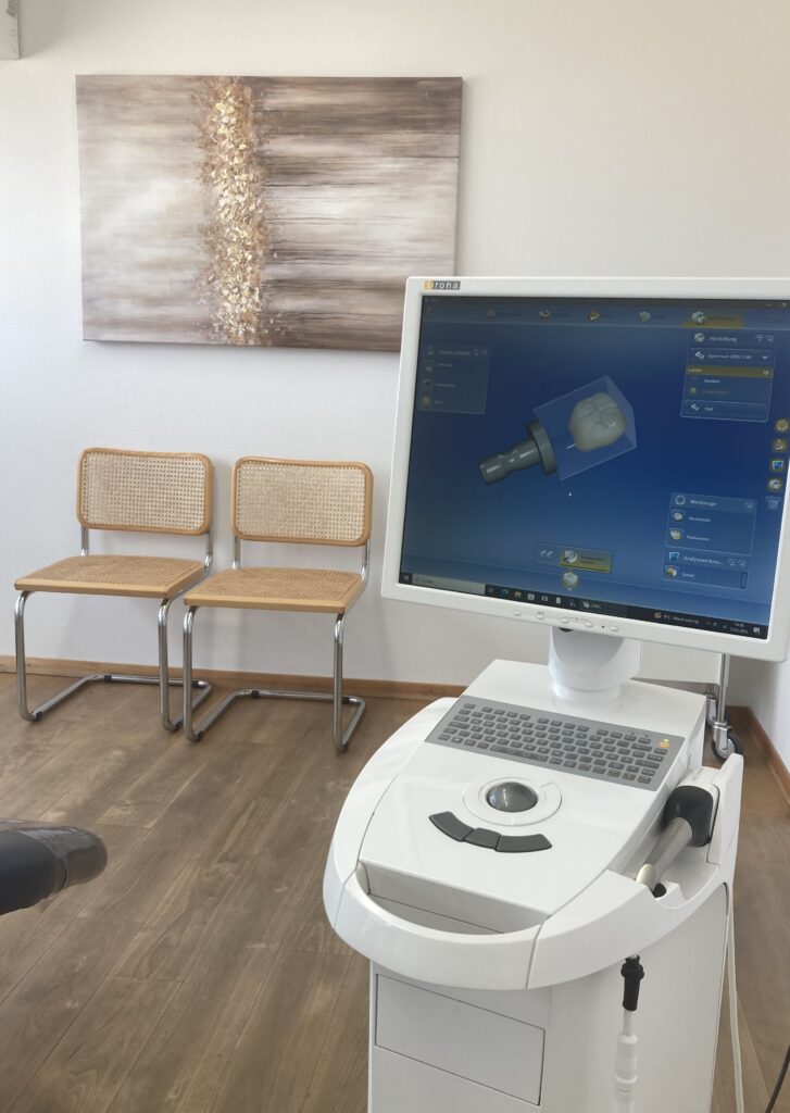 CEREC steht für Chairside Economical Restoration of Esthetic Ceramics und beschreibt ein computergestütztes Verfahren zur Herstellung von hochwertigem Zahnersatz. Anstelle eines herkömmlichen Abdrucks wird der zu behandelnde Zahn mithilfe einer 3D-Kamera gescannt. Anschließend wird der Zahnersatz digital konstruiert, direkt vor Ort aus einem Keramikblock gefräst und eingesetzt. Dies spart nicht nur Zeit, sondern sorgt auch für eine präzise und passgenaue Versorgung.